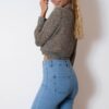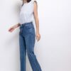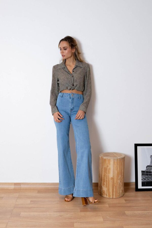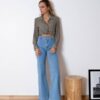 Άνετο τζιν παντελόνι flare, ψηλόμεσο, χωρίς τσέπες, κλείνει μπροστά με δύο κουμπιά και φερμουάρ.